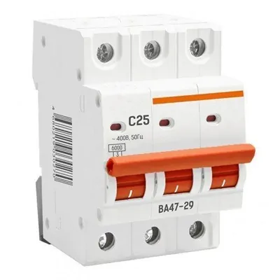 Автоматический выключатель ВА47-29 6кА, 3P 25А типа C обеспечивает надежную защиту электрических цепей от перегрузок и коротких замыканий. Высокое значение отключающей способности (6кА) гарантирует безопасность при аварийных ситуациях. Три полюса позволяют эффективно управлять трехфазными сетями, а номинальный ток 25А подходит для большинства бытовых и легких промышленных нужд. Подходит для профессионального использования и ответственных объектов.