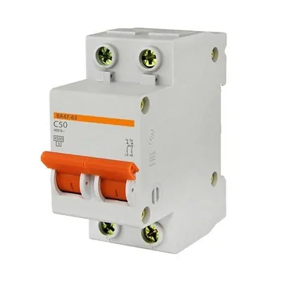 Автоматический выключатель ВА47-63 обеспечивает надежную защиту электрических цепей от перегрузок и коротких замыканий. Назначение характеристики «С» позволяет точно настроить время срабатывания устройства при превышении номинального тока (50 А). Отключающая способность 4,5 кА гарантирует безопасность даже в случае сильных аварийных токов. Двухполюсное исполнение упрощает монтаж и обслуживание системы – все необходимые подключения находятся под одной крышкой.
